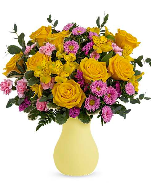 Like springtime sunshine in a vase! Sunny yellow and bright pink blooms fill this cheerful yellow glass arrangement. Sure to spark joy, and brighten any room all year round! 🙂